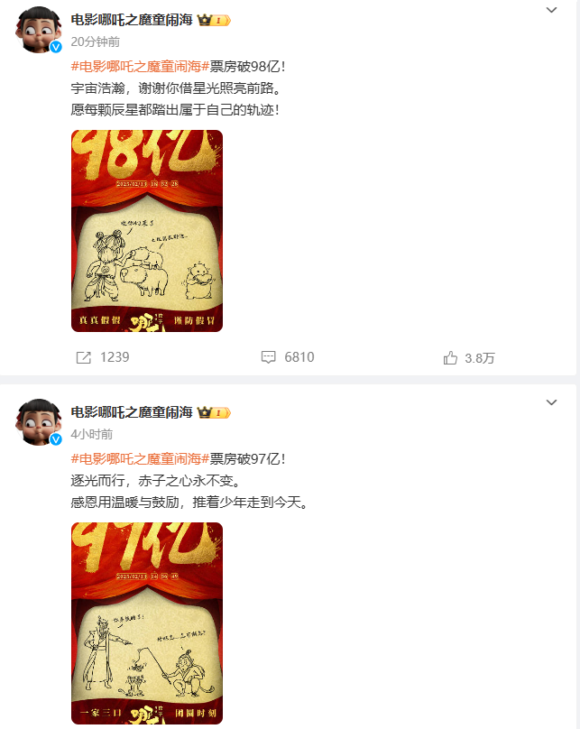 记者发现,@电影哪吒之魔童闹海 官方微博不久前刚更新98亿海报,网友表示,饺子导演的笔要画出火星子了!