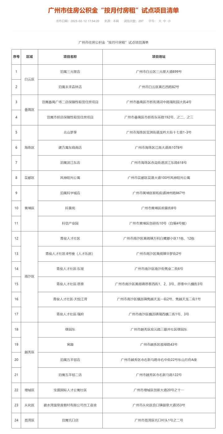 2月12日,广州住房公积金管理中心在官方网站公布试点项目清单,目前,全市共有24个“按月付房租”项目,包括:泊寓三元里店、泊寓未来森林店、泊寓番禺广场二店保障性租赁住房项目、泊寓市桥店保障性租赁住房项目、北山梦享、建方寓东晓南店、泊寓滨江东店、风神阳光公寓、泊寓科学城店、科景苑、科信产业园、青俊人才社区、青俊人才社区·8号楼(人才乐居)、青俊人才社区·东坡、青俊人才社区·思泰、青俊人才社区·天悦江湾、青俊人才社区·瑞府、继园东、窝趣、泊寓五羊邨店、泊寓五羊邨二店、宝盛国际人才公寓社区、碧水湾温泉度假村有限公司员工宿舍、泊寓坑口店。