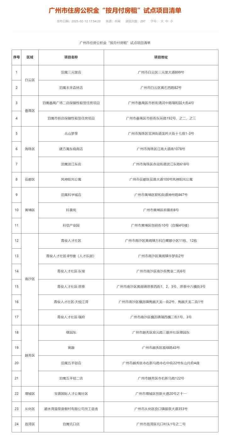 2月12日,广州住房公积金管理中心在官方网站公布试点项目清单,目前,全市共有24个“按月付房租”项目,包括:泊寓三元里店、泊寓未来森林店、泊寓番禺广场二店保障性租赁住房项目、泊寓市桥店保障性租赁住房项目、北山梦享、建方寓东晓南店、泊寓滨江东店、风神阳光公寓、泊寓科学城店、科景苑、科信产业园、青俊人才社区、青俊人才社区·8号楼(人才乐居)、青俊人才社区·东坡、青俊人才社区·思泰、青俊人才社区·天悦江湾、青俊人才社区·瑞府、继园东、窝趣、泊寓五羊邨店、泊寓五羊邨二店、宝盛国际人才公寓社区、碧水湾温泉度假村有限公司员工宿舍、泊寓坑口店。