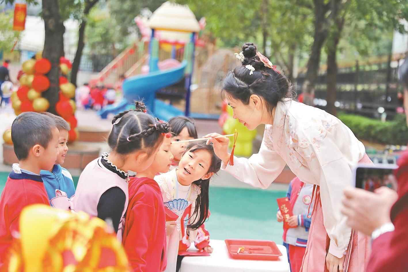 “新年快乐!”“新学期加油!”在颜乐天纪念中学的开学活动上,一声声粤语祝福不时响起。现场,4名家长身着汉服惊艳现身校园,化身“任务NPC”在拱门后迎接学生,并随机派发粤语任务,参与开学活动的学生在完成粤语祝福语、唱粤语新年歌和粤语诗词接龙的互动游戏后,家长将回赠一句粤语祝福,学生则可获得金币巧克力和集章卡。