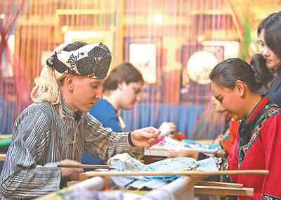 外国游客在重庆秀山土家族苗族自治县体验金珠苗绣。
