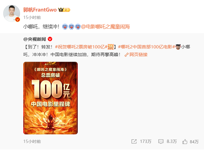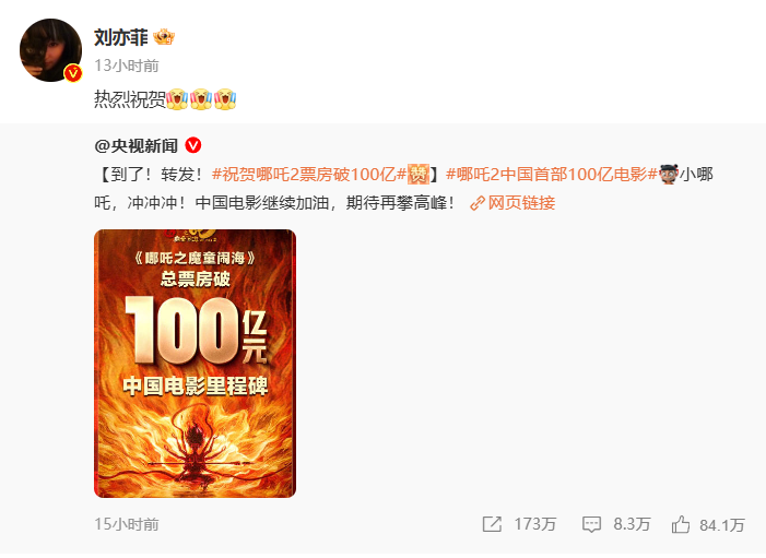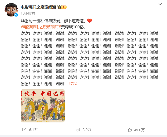 2月14日凌晨,@电影哪吒之魔童闹海连发了100个谢谢。配文:“拜谢每一份相信与热爱,创下这奇迹。”
