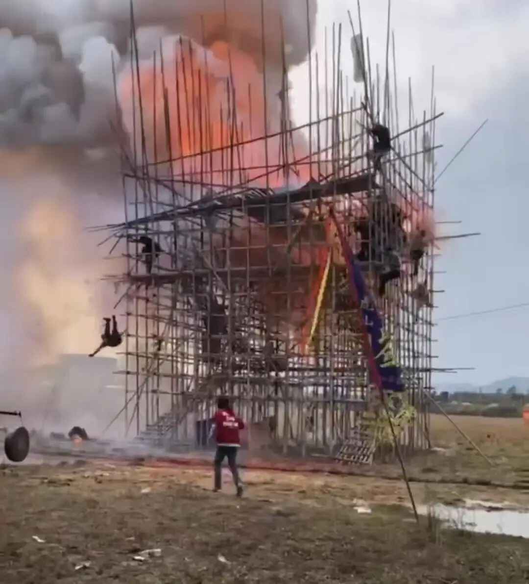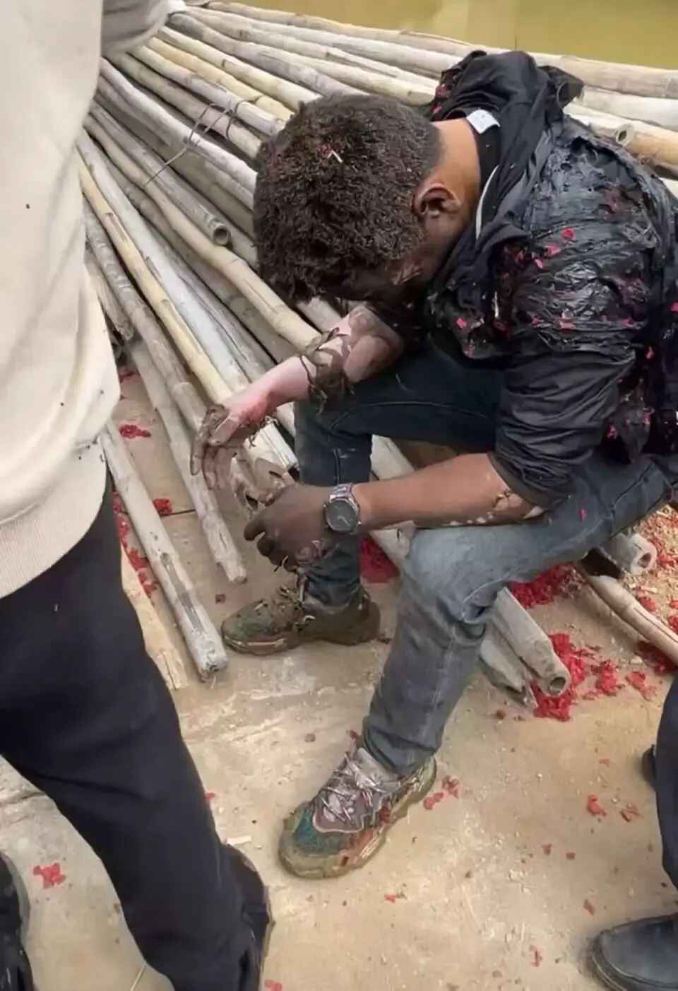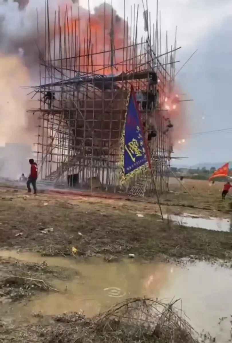 网传现场视频显示,“炮台”上大量鞭炮突然被引燃,多名村民来不及躲避被炸伤,在泥水里打滚,还有人从“炮台”上不慎摔落。