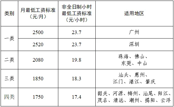 此次调整仍保持四类标准,其中广州、深圳执行一类标准,广州市调整为2500元/月,深圳市调整为2520元/月,两市对应的非全日制小时最低工资标准均为23.7元/小时;二类标准调整为2080元/月,执行地区为珠海、佛山、东莞、中山,对应的非全日制小时最低工资标准为19.8元/小时;三类标准调整为1850元/月,执行地区为汕头、惠州、江门、湛江、肇庆,对应的非全日制小时最低工资标准为18.3元/小时;四类标准调整为1750元/月,执行地区为韶关、河源、梅州等10个市,对应的非全日制小时最低工资标准为17.4元/小时。