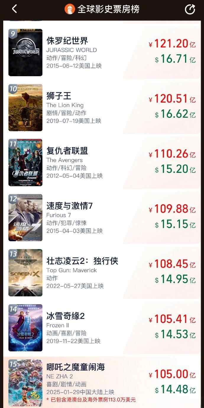 哪吒2进入全球票房TOP15