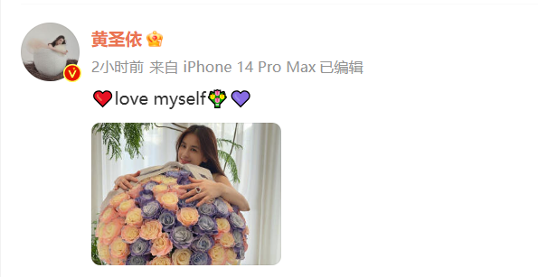 2月14日情人节当天,黄圣依在社媒晒花称“爱自己”。