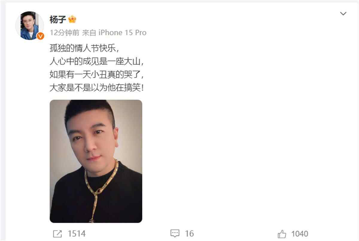 而在当天,杨子微博发文称:“孤独的情人节快乐,人心中的成见是一座大山,如果有一天小丑真的哭了,大家是不是以为他在搞笑!”