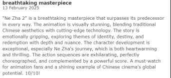 “《哪吒2》是一部激动人心的杰作,在各方面都超过其前作。这部动画在视觉上令人惊叹,融合了中国传统美学和尖端技术。故事扣人心弦,深度探讨了身份、命运和救赎的主题。人物塑造非常出色,尤其是哪吒的成长历程,既温暖人心又惊险刺激。动作场面令人兴奋,完美的编排,并辅以强大的配乐。这是动画迷们的必看之作,也是中国电影走向全球的光辉典范。满分十分我给满分!”