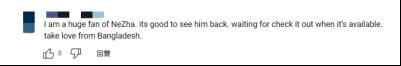 “我是哪吒的超级粉丝,看到他回归真是太好了。等影片上映就去看。来自孟加拉国的爱。”