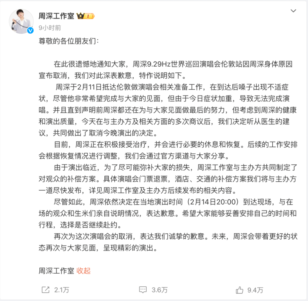 2月15日凌晨,@周深工作室 发布声明,称原定于当地时间2月14日20点(北京时间2月15日4点)的伦敦演唱会因周深身体原因宣布取消。周深在演出时间到达场馆现场,向粉丝和观众鞠躬道歉。