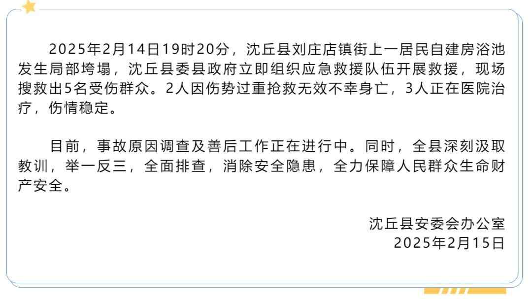2月15日,沈丘县安委会办公室发布通报:2025年2月14日19时20分,沈丘县刘庄店镇街上一居民自建房浴池发生局部垮塌,沈丘县委县政府立即组织应急救援队伍开展救援,现场搜救出5名受伤群众。2人因伤势过重抢救无效不幸身亡,3人正在医院治疗,伤情稳定。目前,事故原因调查及善后工作正在进行中。同时,全县深刻汲取教训,举一反三,全面排查,消除安全隐患,全力保障人民群众生命财产安全。