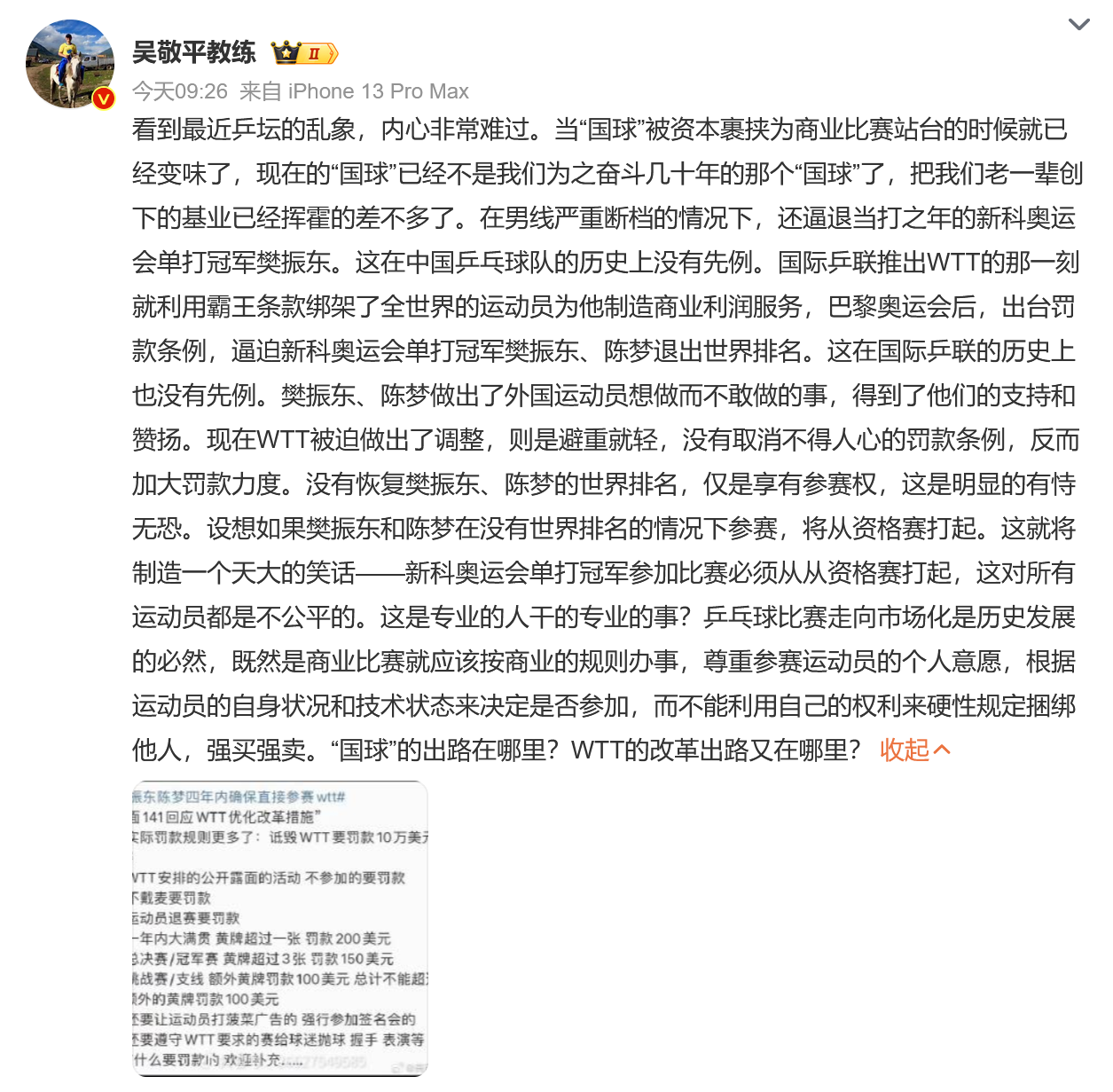 吴敬平在社交媒体写道:“看到最近乒坛的乱象,内心非常难过。当‘国球’被资本裹挟为商业比赛站台的时候就已经变味了,现在的‘国球’已经不是我们为之奋斗几十年的那个‘国球’了,把我们老一辈创下的基业已经挥霍得差不多了。”