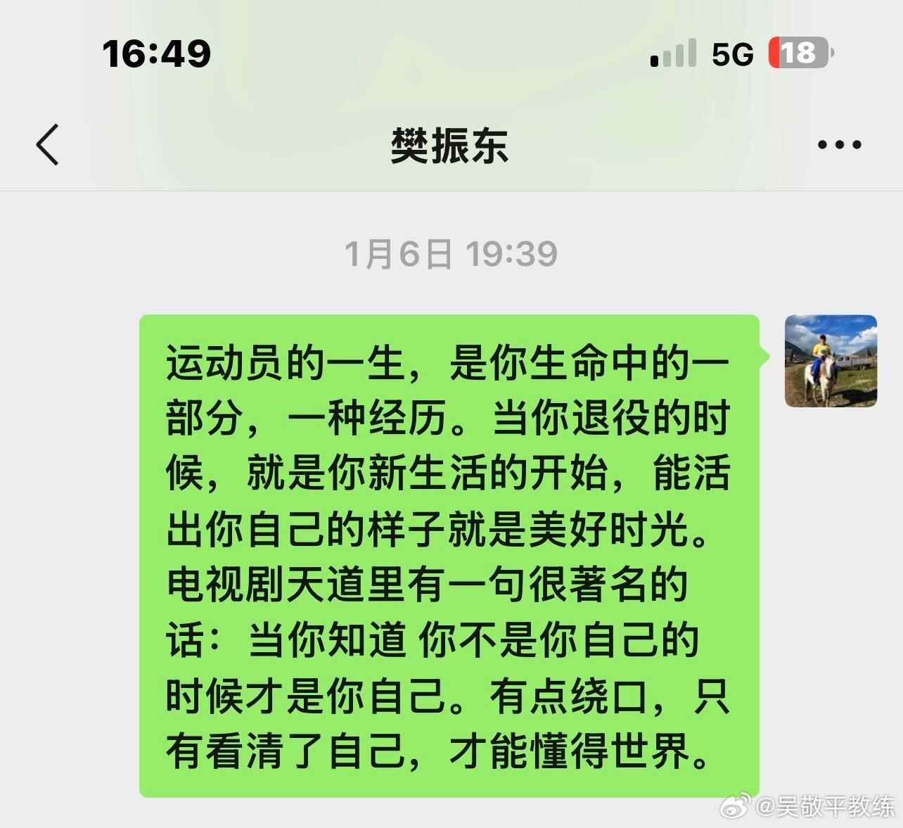 在樊振东宣布退出世界排名的当天,吴敬平就曾为此事发声:“当你不断向上,站到万山之巅时,再回头,你会发现那些讨厌你的人,依旧还在原地,现在却只能仰视你。”随后又在社交媒体上晒出2024年与樊振东聊天截图,鼓励樊振东活出自己。