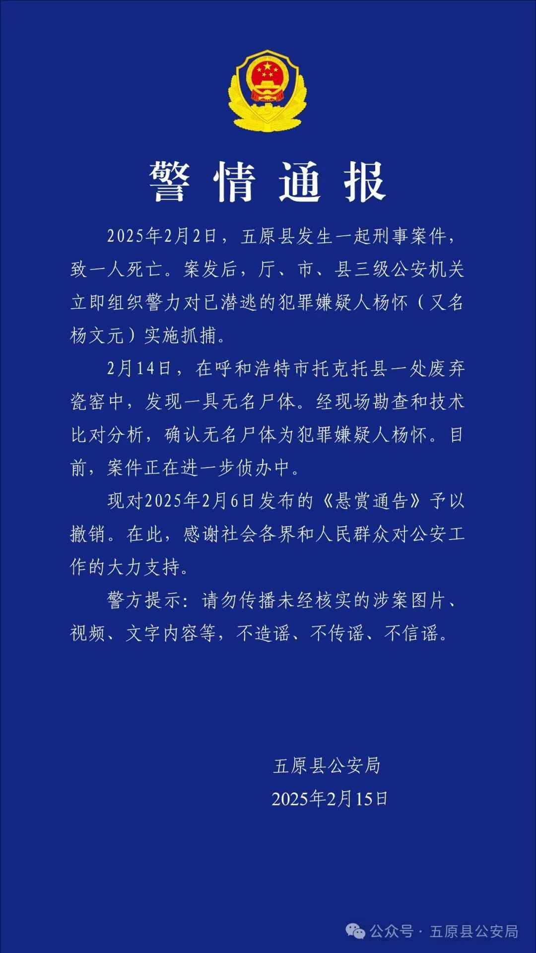 2月14日,在呼和浩特市托克托县一处废弃瓷窑中,发现一具无名尸体。经现场勘查和技术比对分析,确认无名尸体为犯罪嫌疑人杨怀。目前,案件正在进一步侦办中。