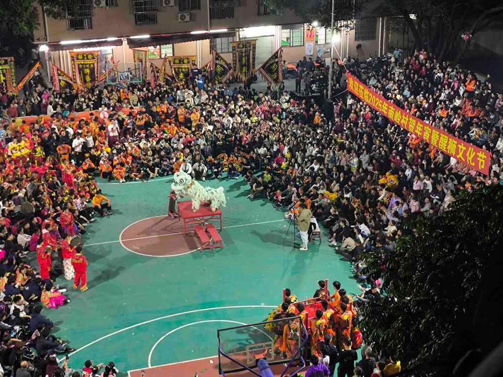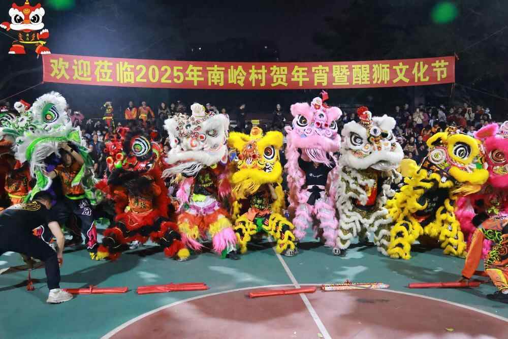 当晚的群狮表演更是将现场氛围推向高潮,群狮在锣鼓声中腾跃翻滚,眨眼、搔痒、舔毛的细节惟妙惟肖。来自粤港澳大湾区的狮队轮番上阵表演《步步高》《人月两团圆》《金蛇献瑞》等精彩节目,并展示“盆青”“台青”“凳青”等传统采青套路,赢得满场喝彩。压轴出场的是由南岭翕和堂醒狮队带来《勇闯高峰》的节目表演,尽显南岭村醒狮的独特魅力和深厚底蕴。活动当天共吸引线上近50万人次通过直播观赏活动盛况。