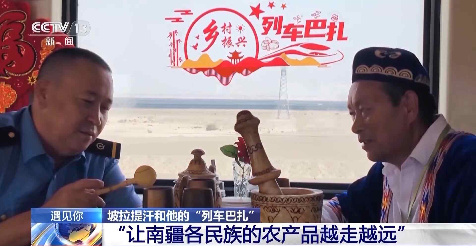 国铁乌鲁木齐局库尔勒客运段列车长 坡拉提汗:欢迎大家坐我们和田开往乌鲁木齐的7557/7558次“和田玉龙号”列车!我们7557/7558次春节之前,每十天搞一次“列车巴扎”年货节,我们今天年货节的主题是,公益助力,乡村振兴。我们最大的目的是,通过我们“和田玉龙号”公益小慢车,让南疆各民族的农产品越走越远!喜欢农产品的同志们到11号、12号车厢选购自己喜欢的产品。