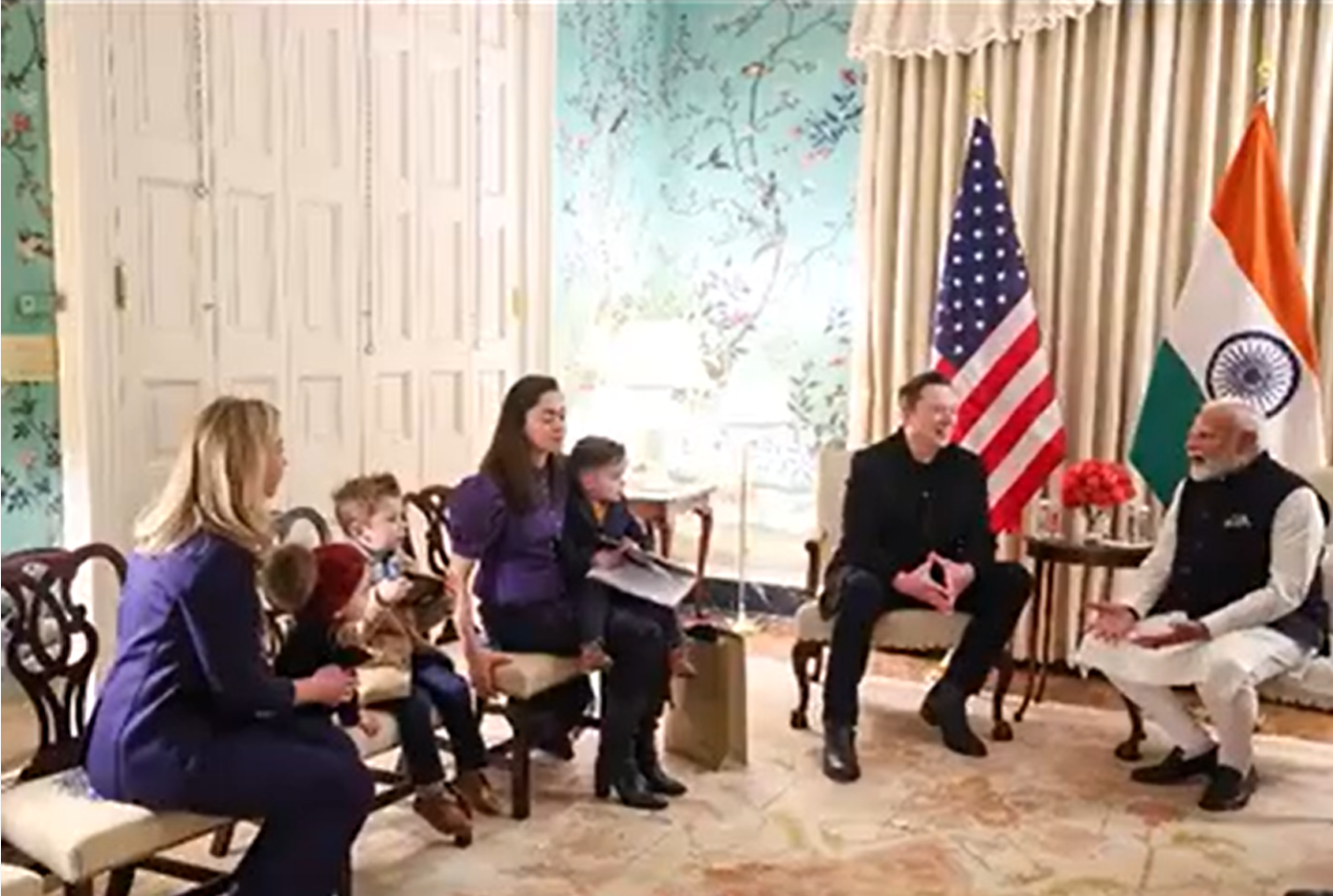 现场画面显示,莫迪与一排西装革履的陪同人员参与会谈,而马斯克则带着两个儿子和一个女儿参与会谈。双方讨论了太空、技术和创新等话题。