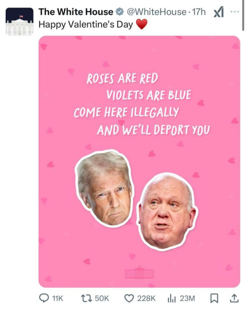 据德国新闻电视频道网站2月14日报道,情人节当天,白宫在社交平台X上向以非正规手段抵达美国的移民送上了一张粉色“贺卡”,上面写着一首打油诗:“玫瑰是红色的,紫罗兰是蓝色的,非法来到这里,我们将驱逐你。”