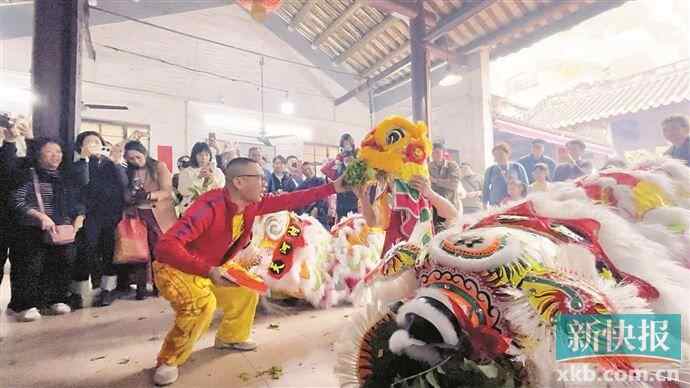 “起鼓!”随着一声号令,现场响起撼动人心的鼓声,第一支醒狮队伍——广州天河龙眼洞村狮队来到牌坊,只见主客双方醒狮同时俯身,向对方致敬。随后陆续有狮队到达,各地狮队同来庆贺,场面热闹非凡。