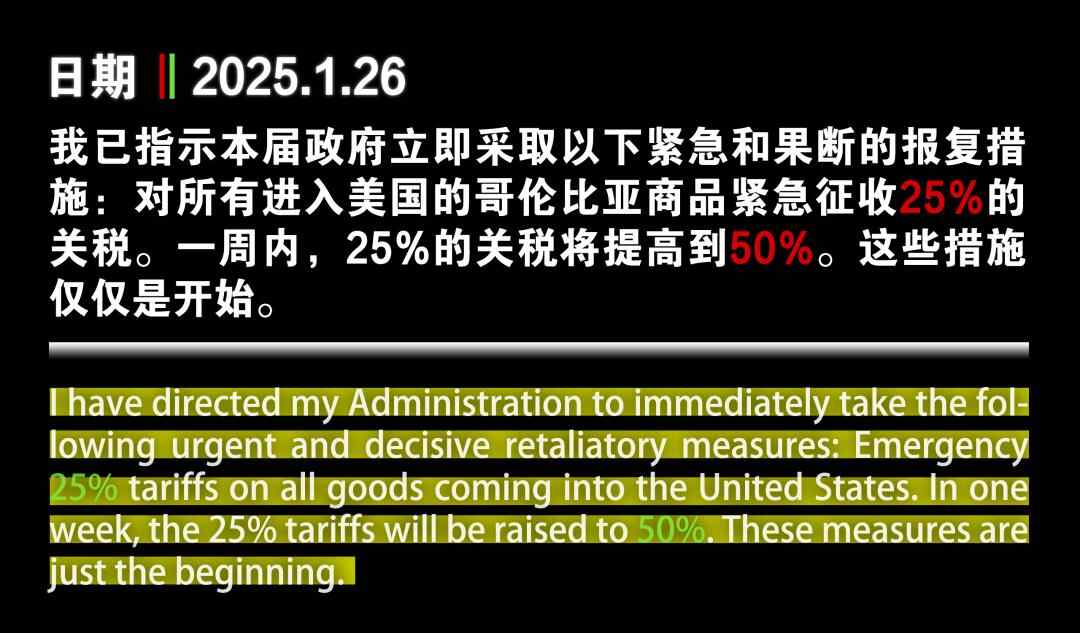 约一周后,特朗普宣布第一项关税措施,针对哥伦比亚。