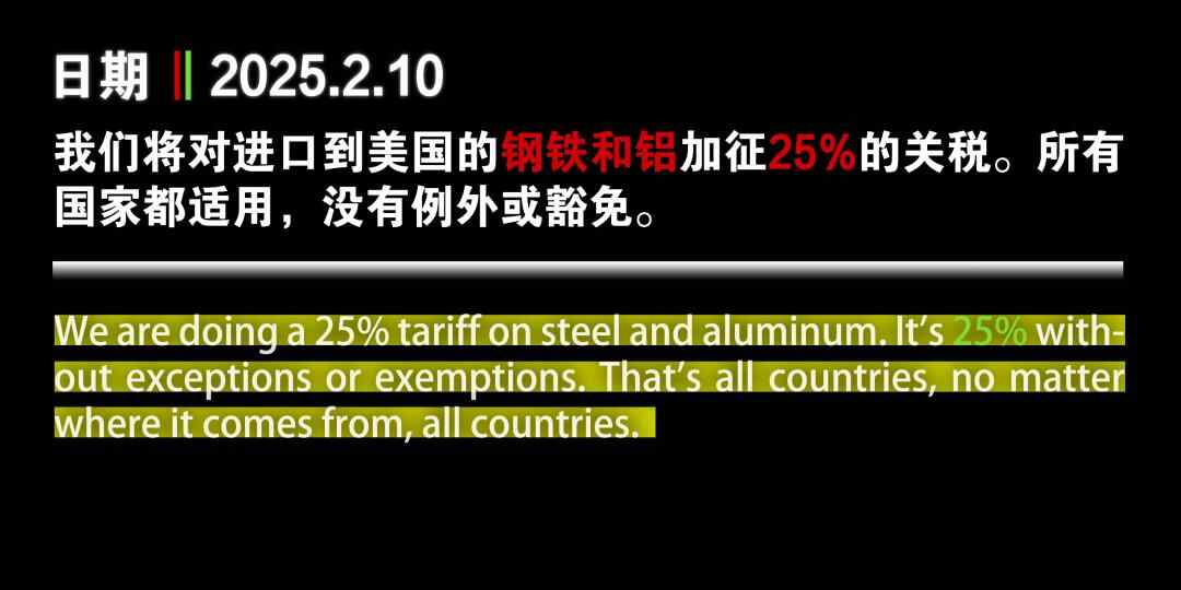 又一周后,特朗普宣布对所有进口至美国的钢铁和铝征收25%关税——加拿大和墨西哥,是美国钢铝的主要进口来源地。特朗普这一次特别表示,相关要求“没有例外和豁免”。