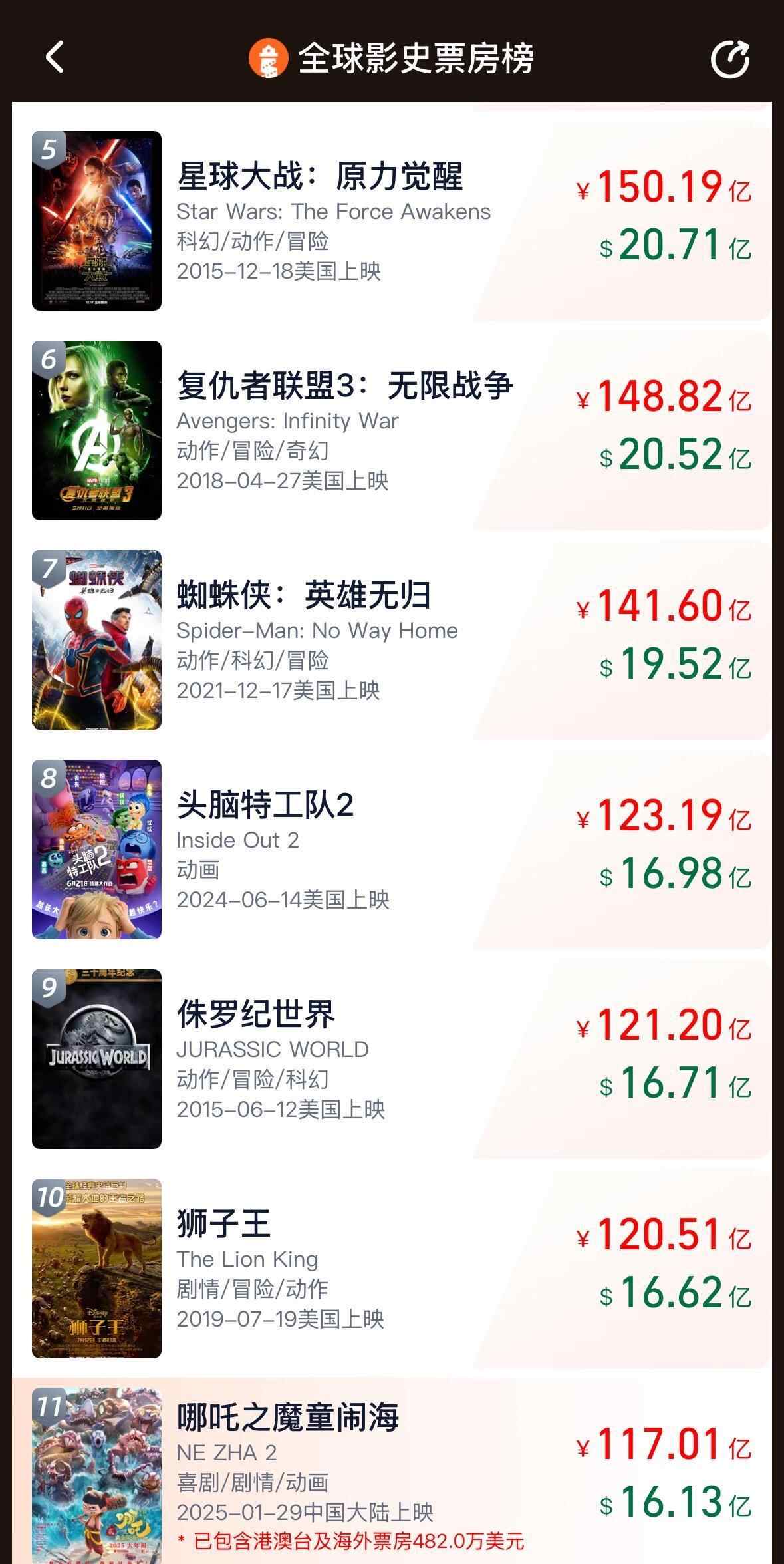 全球影史票房榜第10位是2019《狮子王》的120.51亿,两者相差仅3.5亿。