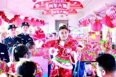 在4184次列车上,乘务人员用秧歌舞庆祝第三季列车大集正式开集。徐率摄/光明图片