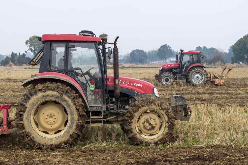 ■在浙江省金华市,稻田里农机正在进行翻耕作业。