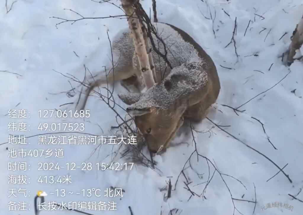2025年1月3日,据野生动物保护志愿者发布的文章介绍,2024年12月28日至30日,志愿者在黑河五大连池市、逊克县、孙吴县,伊春市友好区、丰林县等多地林场进行巡护时,发现大量猎套,部分区域还有高压电网。在五大连池市龙镇林区,猎套密度极高,志愿者们发现一只怀孕的母狍子被困死。