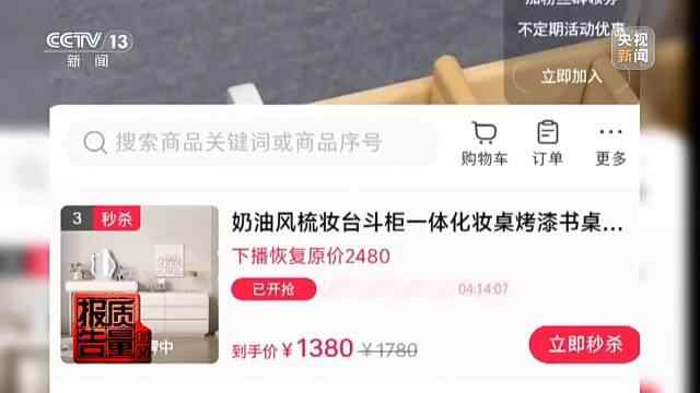 例如一个主营家具的直播间销售的一款梳妆台。据带货主播介绍,这款梳妆台在直播间购买有优惠,到手价1380元,另外在显著位置用红色字体标注“下播恢复原价2480”,按照这样的折扣力度计算,相当于消费者可享受5.5折的优惠。然而当记者仔细观察时发现,在“到手价1380”后有一个数字“1780”被划掉了,这个被划掉的价格用了不明显的灰色小字标注,很容易被消费者漏掉。而按照这一划线价来算,消费者实际享受的折扣仅为7.7折。