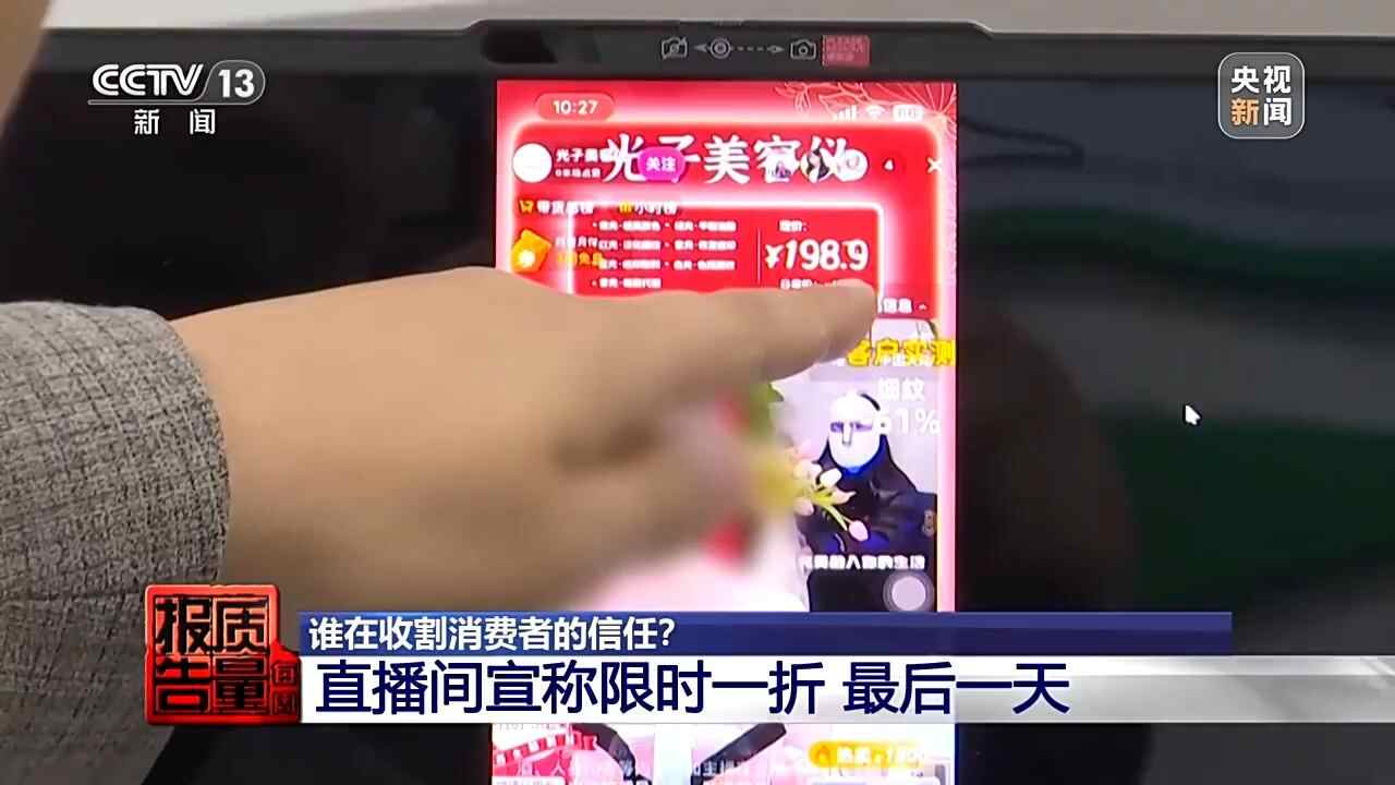 在直播时记者看到,带货主播反复强调限时优惠只剩最后一天。在该直播结束后的两天,记者连续对该美妆店直播活动进行观察。结果发现第二天,该直播间再次开启直播,销售的美容仪与前一日相同,售价仍为198.9元,并未恢复至日常价格1980元;