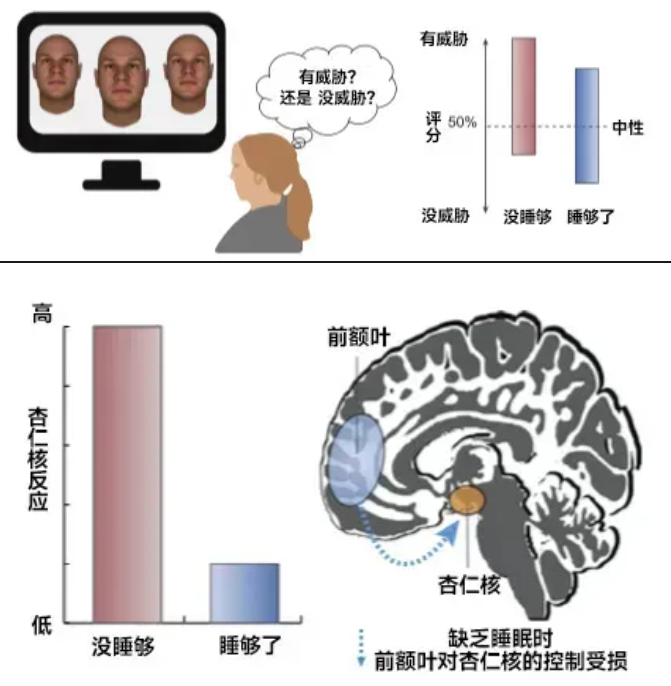 不少研究表明,即使是一个晚上的睡眠缺乏,也会让大脑杏仁核变得异常活跃,更容易有焦虑、恐惧、愤怒等激烈的负面情绪。