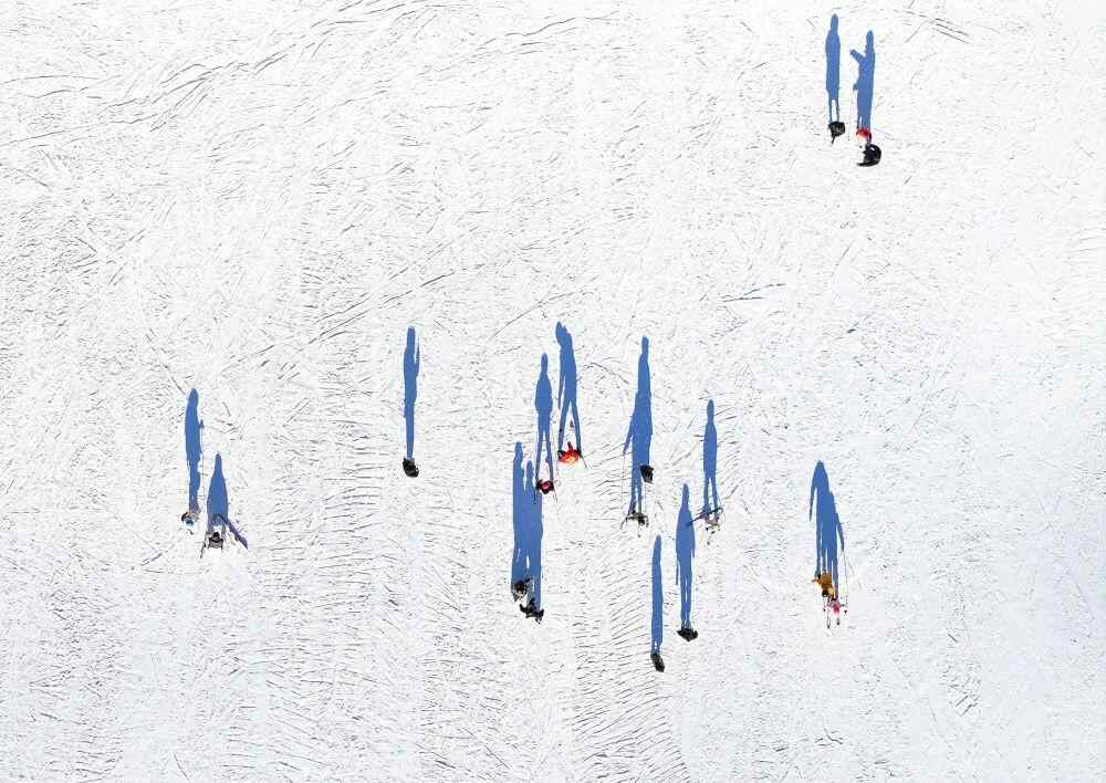 滑雪爱好者在内蒙古呼伦贝尔扎兰屯市金龙山滑雪场滑雪(无人机照片)新华社记者连振 摄