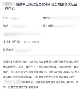 中山市翠亨新区公安分局反诈民警发现该涉诈线索后,立即上门劝阻,迅速对涉案资金开展追踪、拦截等调查工作,成功拦截资金14.5万元。