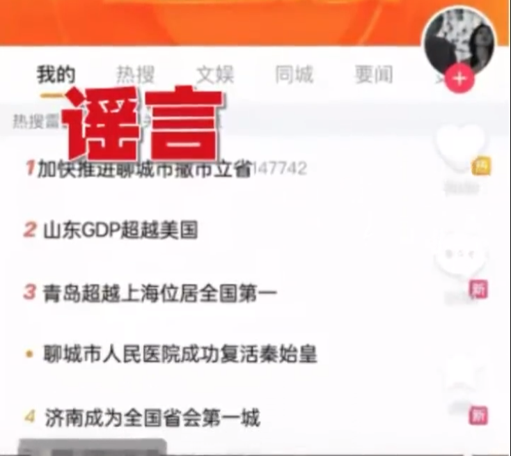 近日,山东聊城一网民在某网络平台发布虚假视频信息,该信息为“P图”伪造微博热搜榜图片,包含“聊城市人民医院成功复活秦始皇”“山东GDP超越美国”等不实言论。该信息发布后,视频累计播放量达23万人次,转发1.4万次,迅速引发网民热议,造成不良社会影响。目前,违法行为人聂某某(男,现年25岁,阳谷县西湖镇人)已被当地警方依法行政处罚。