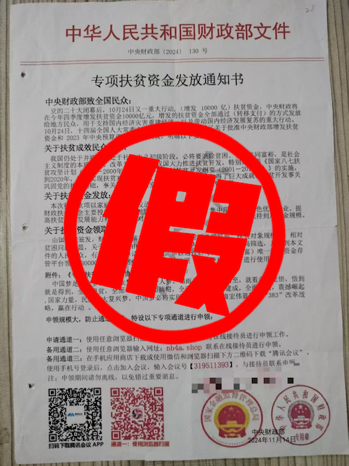 “中央财政部发放专项扶贫资金,审核通过可获得300万元。”有这等天上掉馅饼的“好事”?近日,阳江市民袁先生收到了一个快递,拆开后竟然发现里面有一份《专项扶贫资金发放通知书》和《专项扶贫资金使用协议书》的文件,落款盖章单位分别是“国家金融监督管理总局”“中华人民共和国财政部专用章”,且文件上的内容声称可以通过“扫描特定二维码”“点击进入特定网址”或“下载特定APP”等渠道申领300万元的专项扶贫资金。