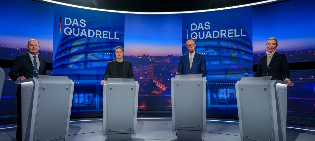 当地时间2月16日,德国社民党总理候选人朔尔茨、德国基督教民主联盟总理候选人梅尔茨、德国选择党总理候选人魏德尔和德国绿党总理候选人哈贝克举行电视辩论。四位候选人在辩论中主要就德国的经济政策、税收政策、移民政策和安全与外交政策展开交锋。