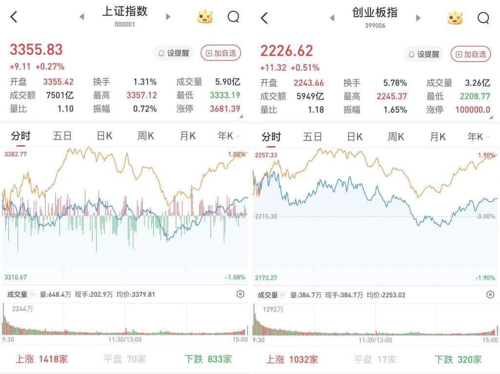 至收盘,上证综指涨0.27%,报3355.83点;科创50指数涨1.45%,报1037.31点;深证成指涨0.39%,报10791.06点;创业板指涨0.51%,报2226.62点。