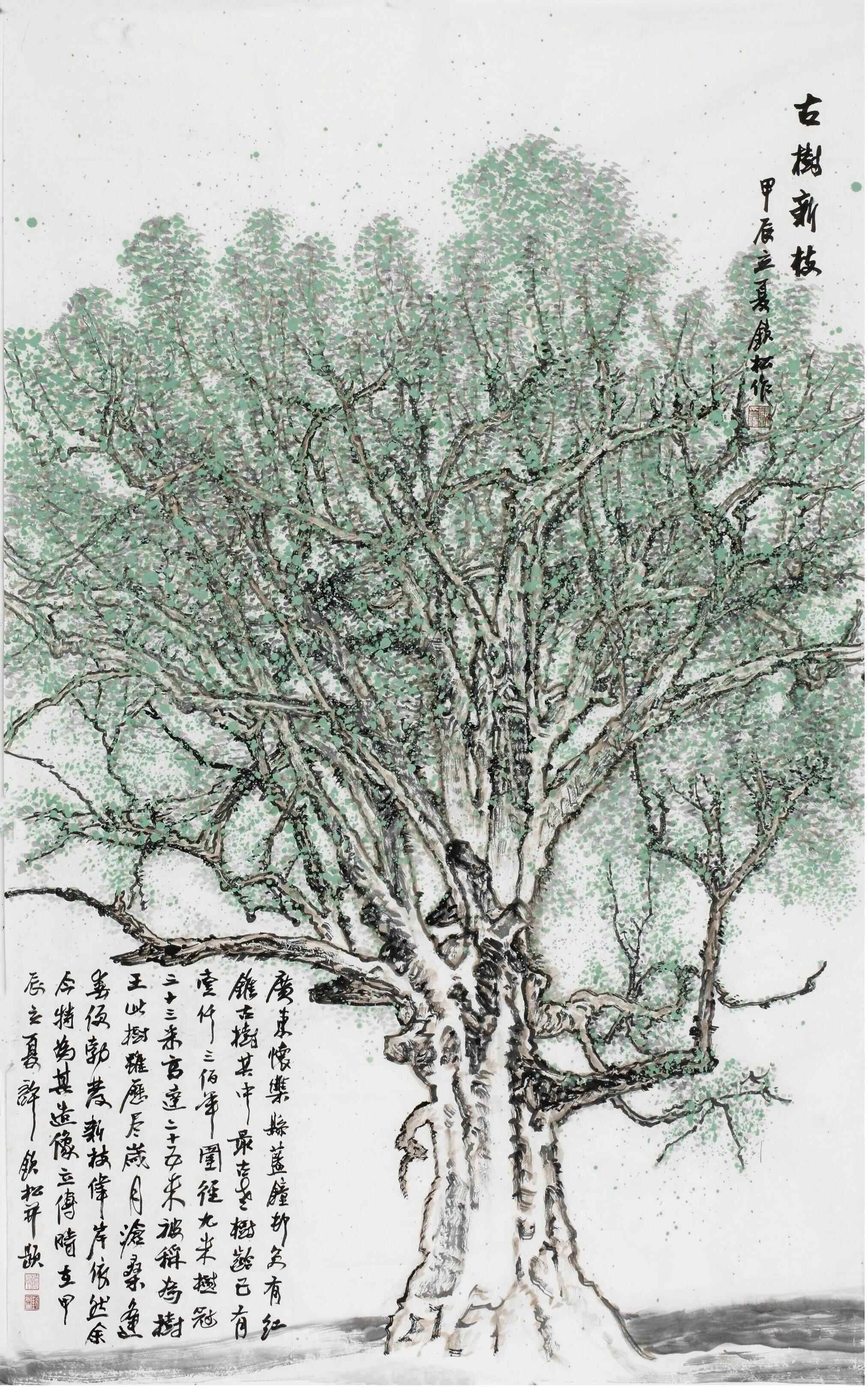 这幅画作以肇庆怀集蓝钟镇根竹塘村一株已有1300多年历史的红锥古树为创作对象,古树历经沧海桑田,树皮斑驳累累,印刻着时间留下的痕迹,却仍然伟岸挺拔,每逢春季便勃发新枝。这种顽强的生命力深深打动了许钦松,促使他以笔墨为媒,为古树造像,用艺术记录下这份千年不朽的坚韧与生机。