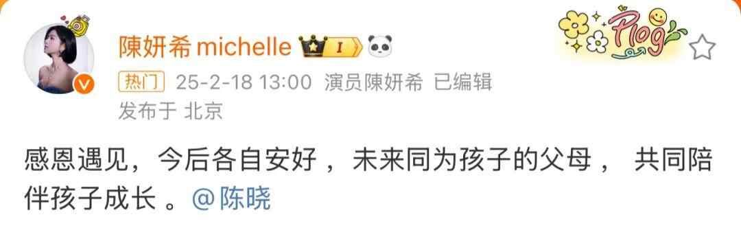 两人发文并@对方:“感恩遇见,今后各自安好,未来同为孩子的父母,共同陪伴孩子成长。”