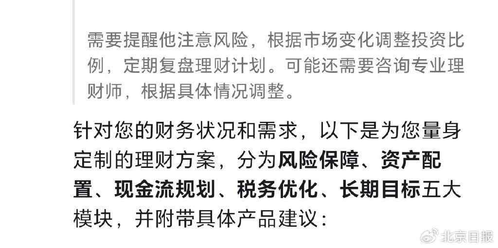 “DeepSeek教小白理财,强得可怕,超级具体!”DeepSeek的理财方案分享充斥网络。记者也提供了年龄、收入、开支、家庭等要素,请DeepSeek推荐理财方案。结果,它以风险保障、资产配置、现金流规划、税务优化、长期目标五大模块,分别做出解释,甚至有具体的理财产品推荐。在思考中,它也有“需要提醒他注意风险,根据市场变化调整投资比例,定期复盘理财计划。可能还需要咨询专业理财师,根据具体情况调整”这样的语句。