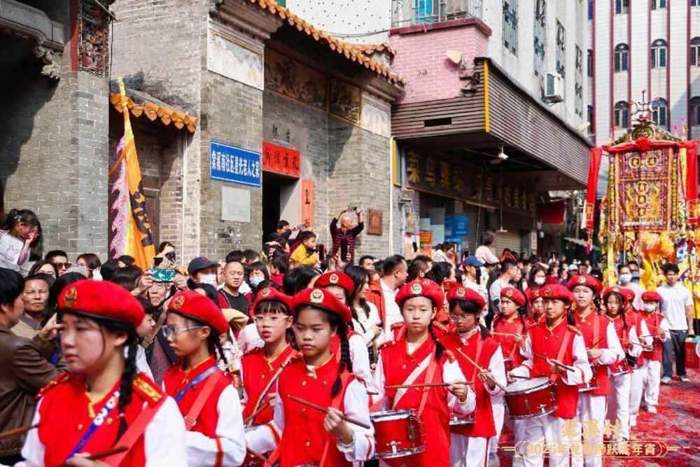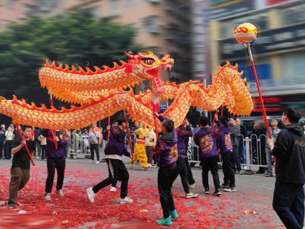 巡游现场,锣鼓声、欢呼声不断,由12头醒狮、2条彩龙和一支仪仗队组成的百米巡游队伍浩浩荡荡而来,其中龙狮队伍均来自村内,仪仗队则是由棠溪小学学生组成,队员个个精神抖擞,排着整齐的队伍,用响亮有力的鼓号声为巡游助兴。