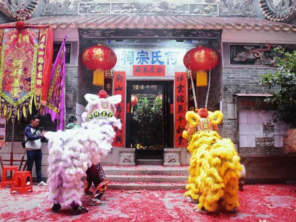 今年棠下村醒狮队沿街在村内颜氏宗祠、康公古庙和标志建筑前表演“采青”,传达美好祝愿,在按照村中传统惯例,舞狮过后是功夫表演,村中继承下来的功夫以洪拳相传,许多村民都会学习。