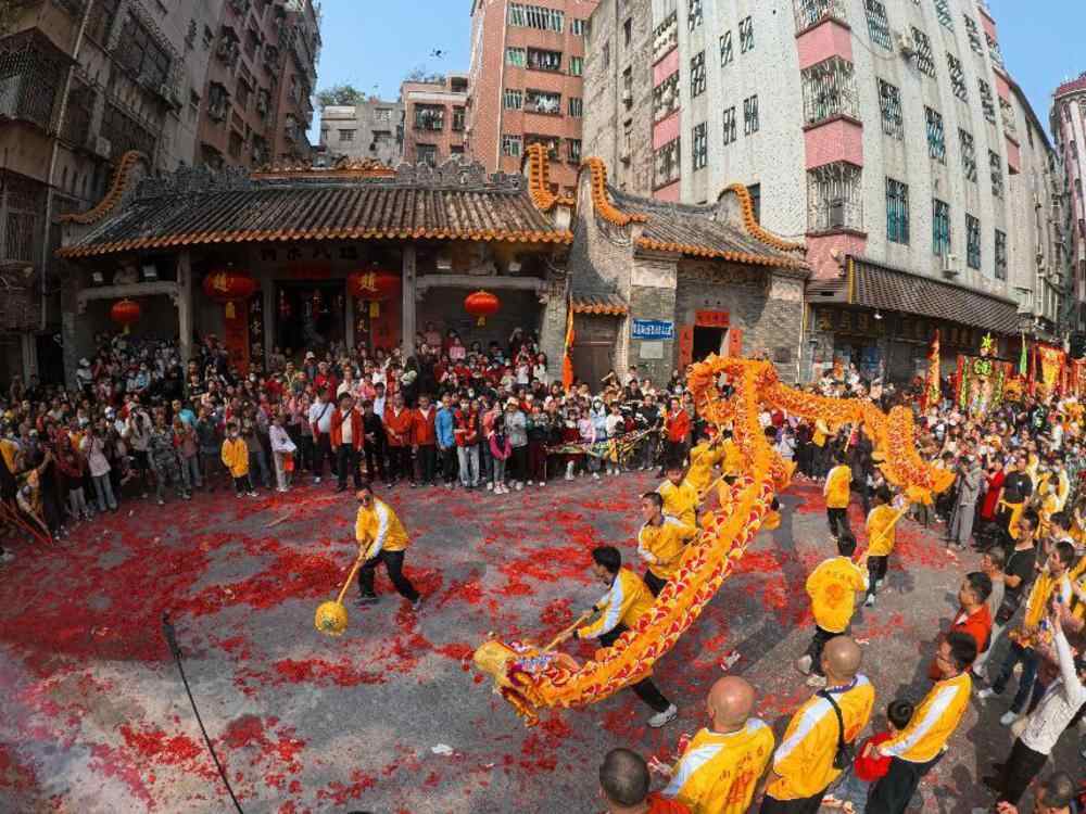 此前的2月14日(正月十七),棠溪村祥岗片区和岗贝片区便已举办龙狮巡游活动,各兄弟狮队会面时,“狮子”低蹲俯身相对行礼,随后一同沿着各个宗族祠堂和庙宇,进行拜谒和表演,祈求新的一年风调雨顺、五谷丰登。