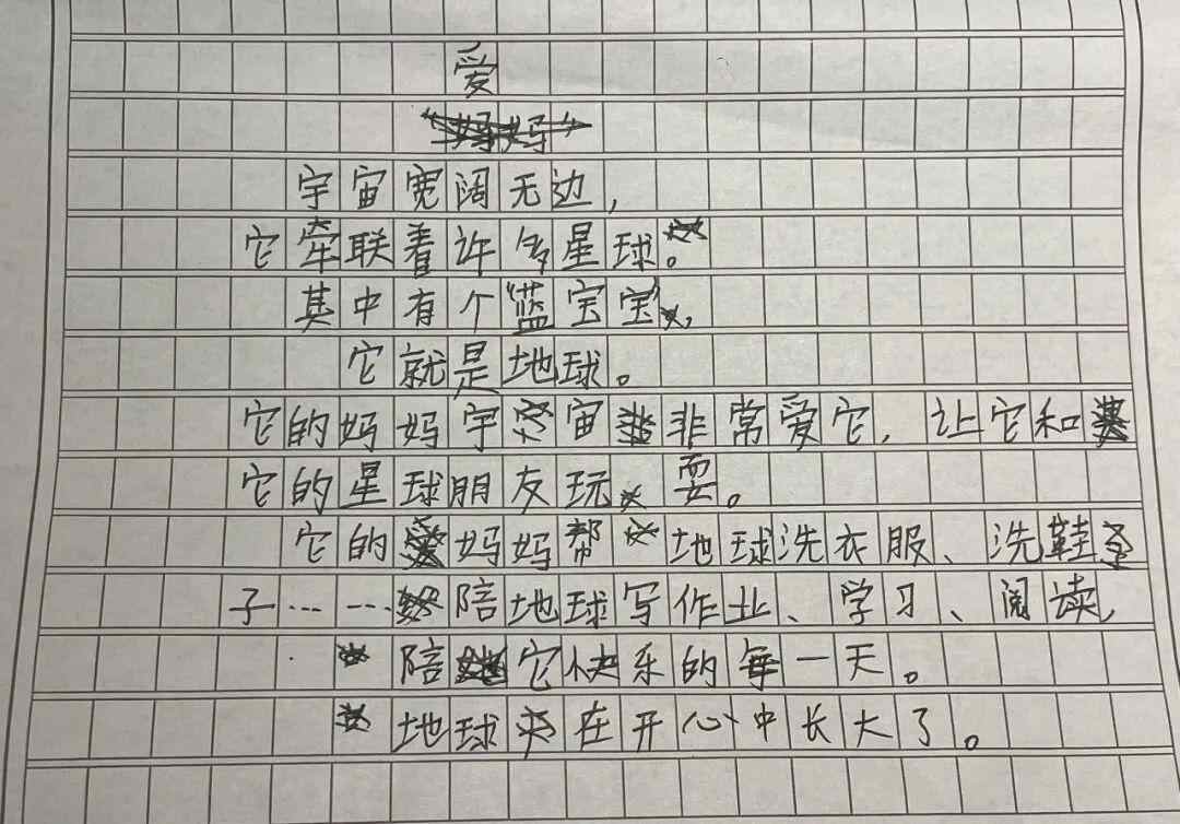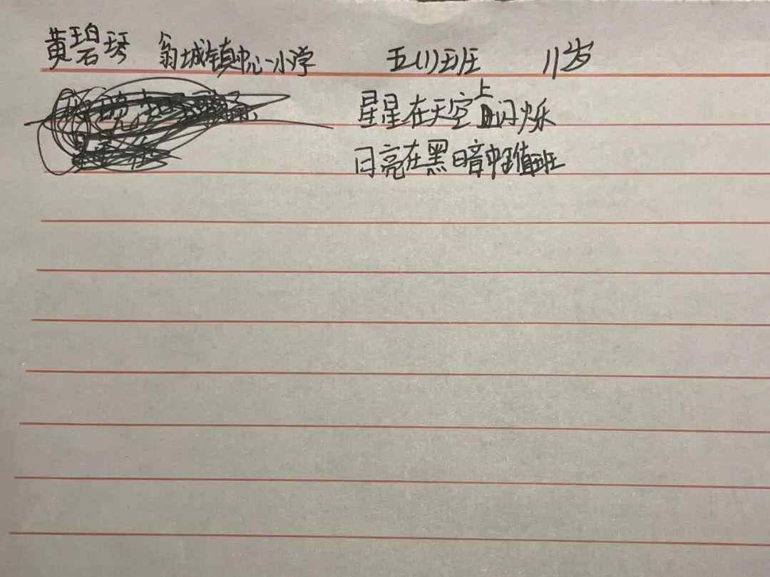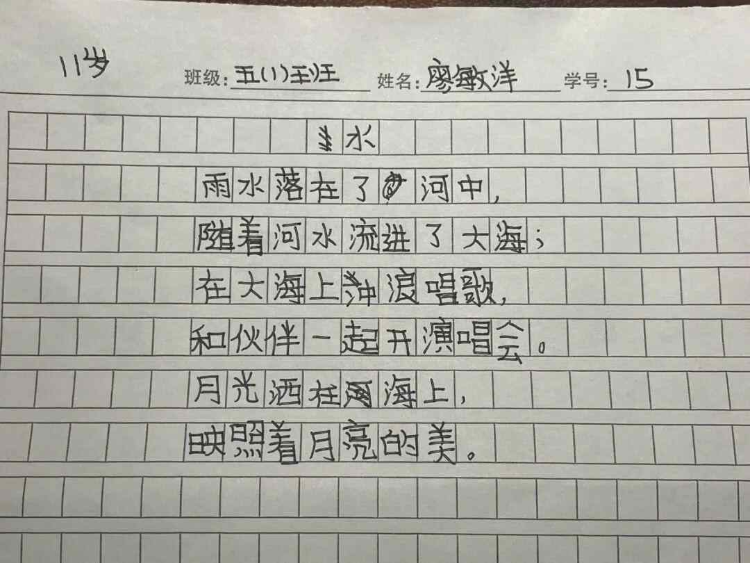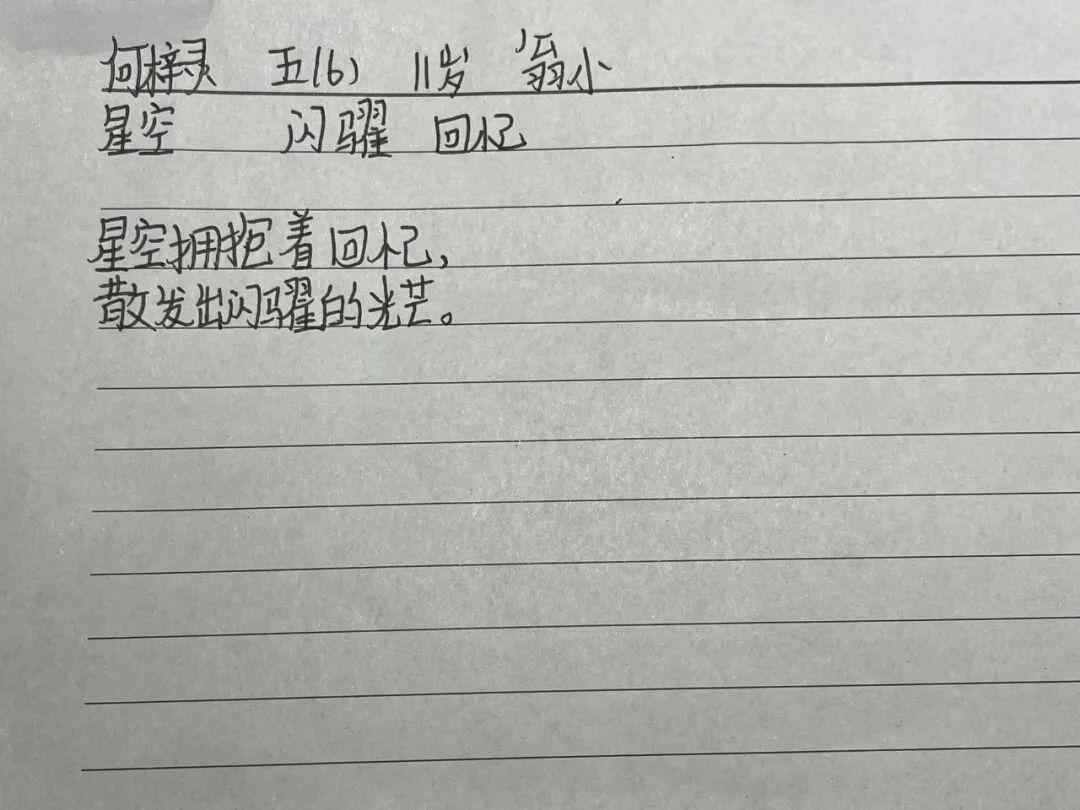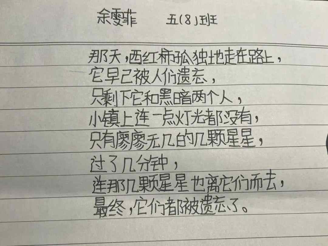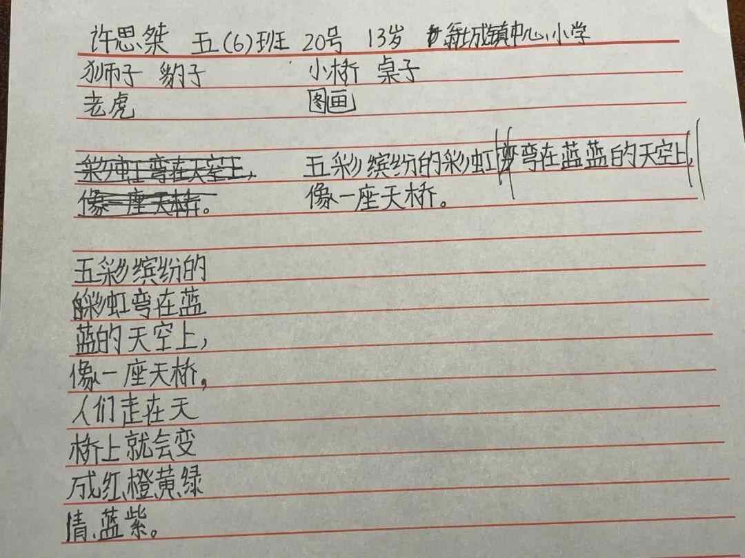 我也给同学看了几首小诗,作为例子,主要是让大家更容易理解要写什么、怎么写。开始创作的时候,大部分同学都能快速地动笔,但也有一些同学不知道写什么。有一位同学就和我说不知道写什么,我在一旁引导她。