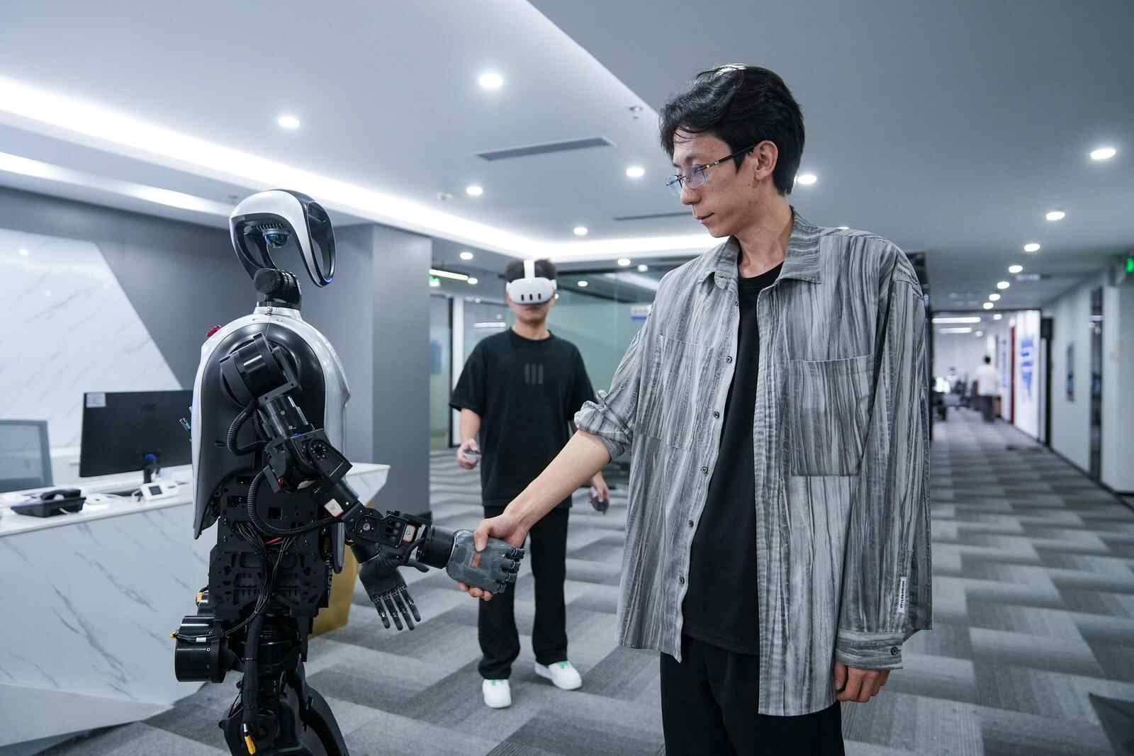 乐聚机器人最新款KUAVO4PRO与人握手。羊城晚报记者 蔡嘉鸿 摄