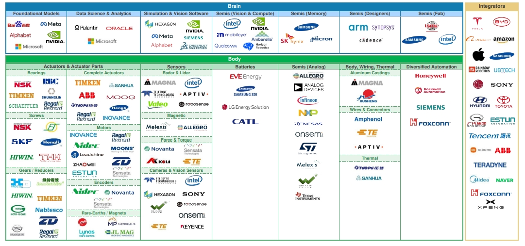 “大脑”板块,百度、台积电、地平线3家中国企业入榜,涉及晶圆代工、基础模型、半导体视觉;“身体”板块,亿纬锂能、宁德时代、旭日集团、双林股份、拓普集团、三花智控、汇川技术、绿的谐波、鸿海集团(富士康)等24家中国企业上榜,占比最高,涉及电子元器件、电池、执行器、电机、传感器等产品。