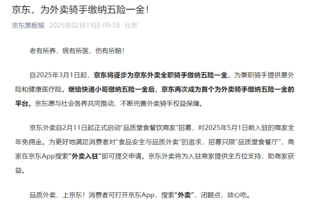 2月19日,京东黑板报发文,自2025年3月1日起,京东将逐步为京东外卖全职骑手缴纳五险一金,为兼职骑手提供意外险和健康医疗险。继给快递小哥缴纳五险一金后,京东成为首个为外卖骑手缴纳五险一金的平台。