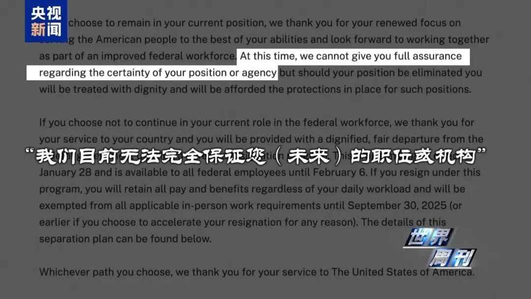 如果联邦雇员在2月6日前接受“买断”,也就是自愿离职,他们可以继续领取工资直至9月30日。如果选择留下,则:“我们目前无法完全保证您(未来)的职位或机构”。