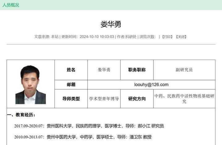 记者注意到,娄华勇1986年出生于贵州遵义,2006年考入贵州中医药大学,获得理学学士后,于该校攻读了中药学方向的医学硕士,师从潘卫东教授。随后曾在贵州省中国科学院天然产物化学重点实验室担任实习研究员和助理研究员,又于2017年师从郝小江院士,攻读贵州医科大学民族药药理学方向的医学博士。他获得博士学位后,2021年至今,在贵州省天然产物研究中心(贵州医科大学产物化学重点实验室)担任副研究员。